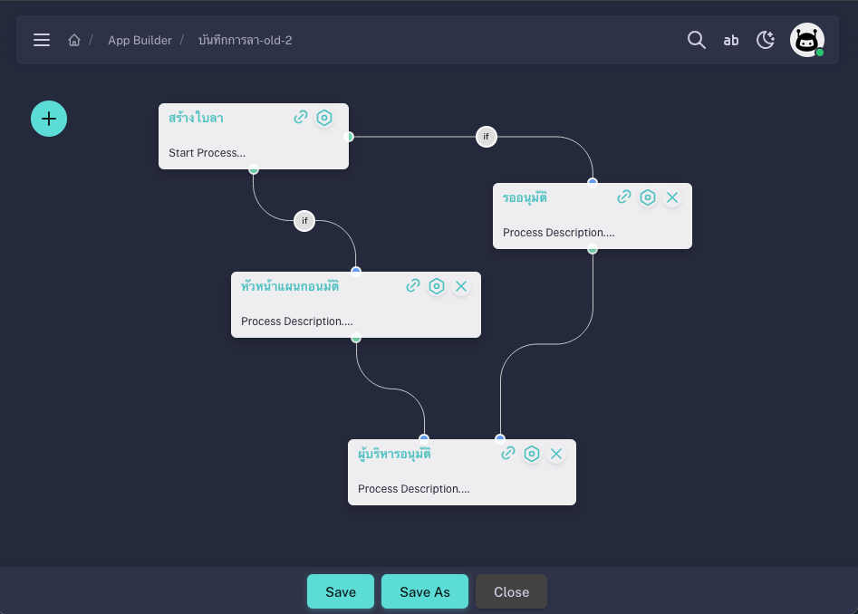 กระบวนการใดก็ตามที่มีลำดับขั้นและผู้ดำเนินการชัดเจน สามารถออกแบบได้ เช่น อนุมัติรับคน โครงการ ของบ ส handover อุปกรณ์ คุณกำหนดขั้นตอน เงื่อนไข และสิทธิ์ได้เอง การสรรหา · อนุมัติโครงการ · ของบประมาณ · โอนย้ายทรัพย์สิน